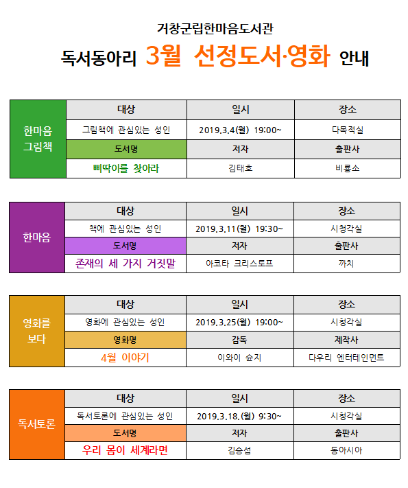 3월 독서동아리 선정도서 및 모임일정 안내