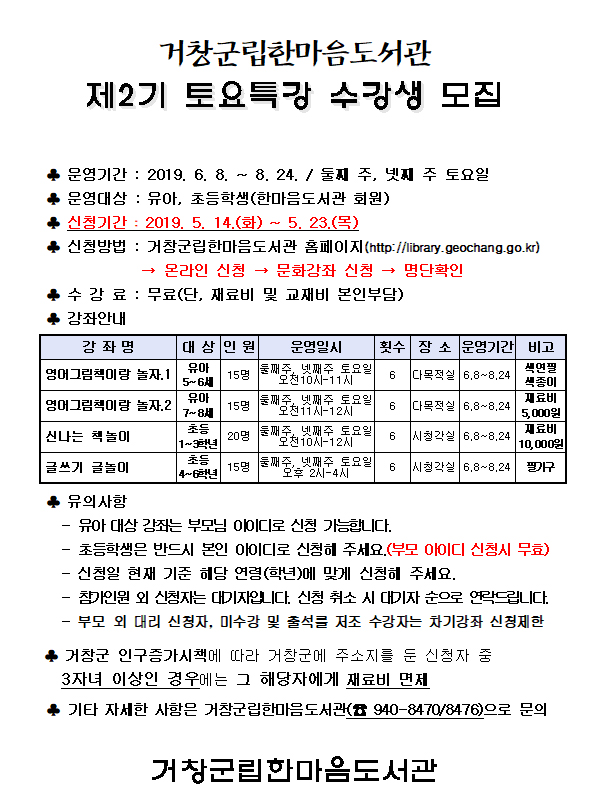 제 2기 토요특강 수강생 모집안내