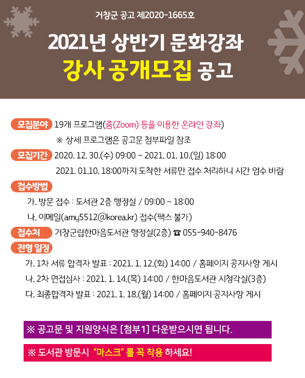 2021년 한마음도서관 상반기 문화강좌 강사 공개 모집 공고