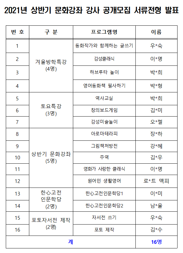 2021년 상반기 문화강좌 강사 공개모집 서류전형 발표