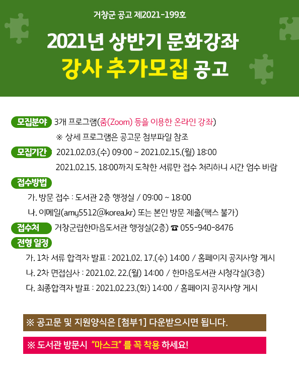 2021년 한마음도서관 상반기 문화강좌 강사 추가모집 공고