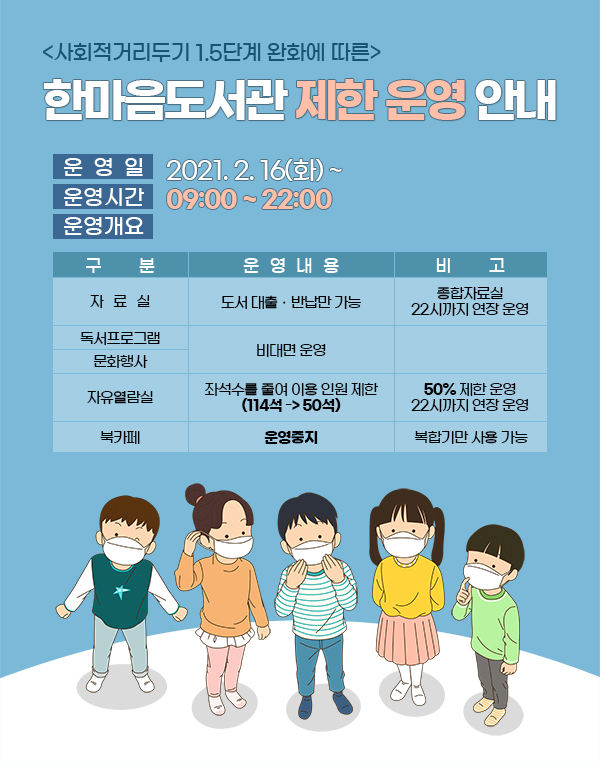 사회적거리두기 1.5단계 완화에 따른 한마음도서관 제한 운영 안내