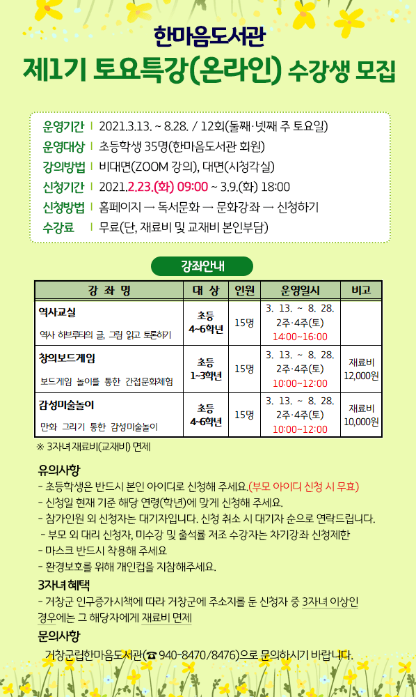 운영강좌 : 역사교실(초등4-6), 창의보드게임(초등1-3), 감성미술놀이(초등4-6)