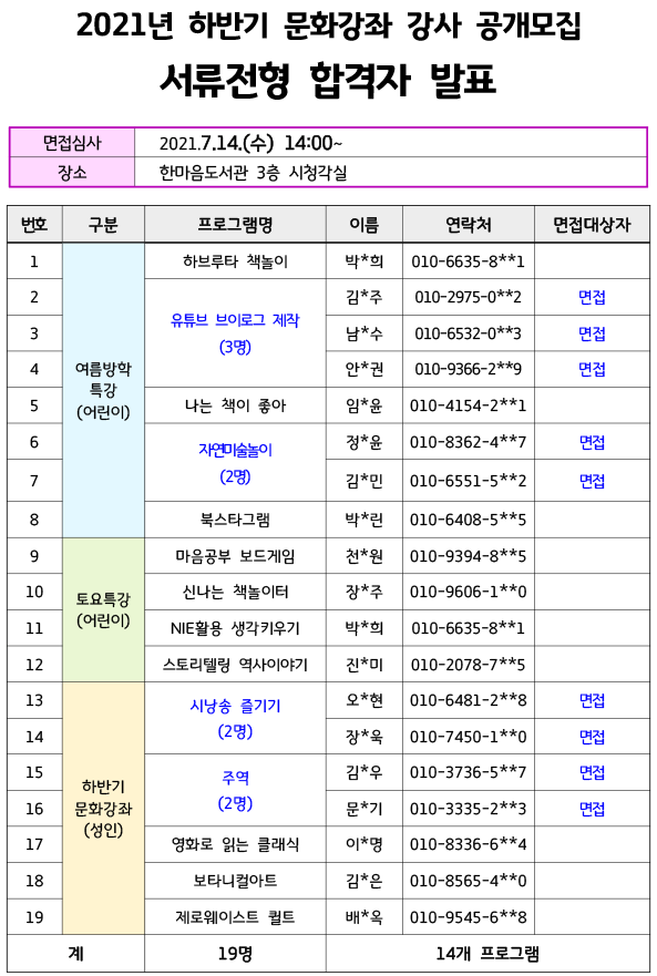 2021년 하반기 문화강좌 강사 공개모집 서류전형 합격자 발표
