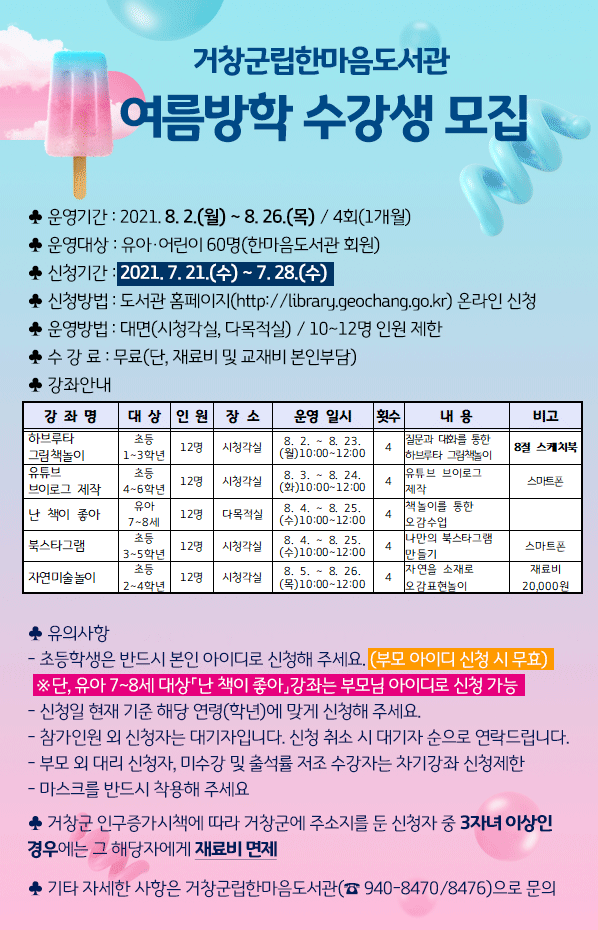 ♣ 운영강좌 : 하브루타 그림책놀이[초1-3], 유튜브 브이로그 제작[초4-6], 난 책이 좋아[유아7-8세], 북스타그램[초3-5], 자연미술놀이[초2-4]