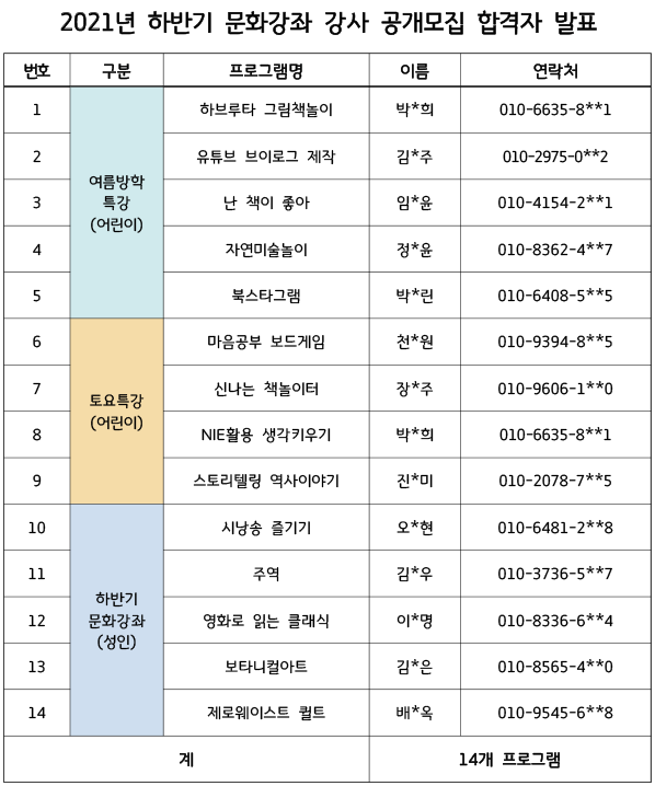 2021년 하반기 문화강좌 강사 공개모집 합격자 발표
