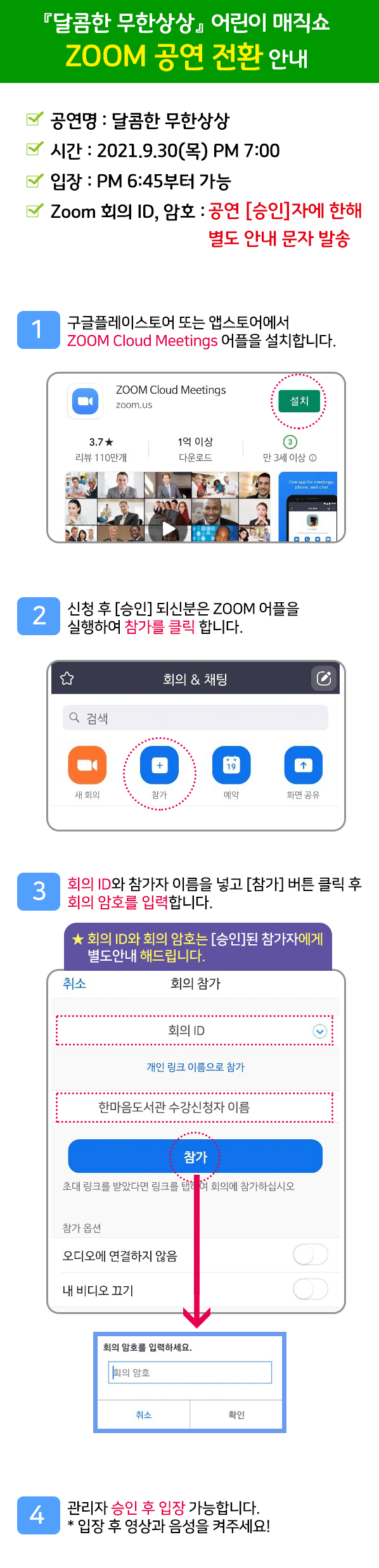 Zoom 회의 ID, 암호 : 공연 [승인]자에 한해 별도 안내 문자 발송