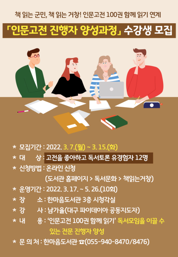 모집대상 : 고전을 좋아하고 독서토론 유경험자 12명