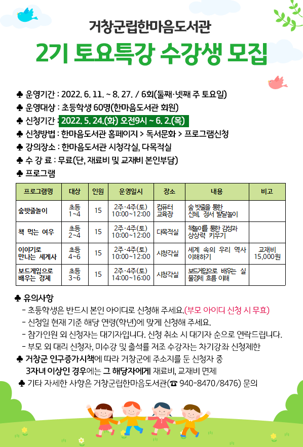 ♣ 운영대상 : 초등학생 60명(한마음도서관 회원)