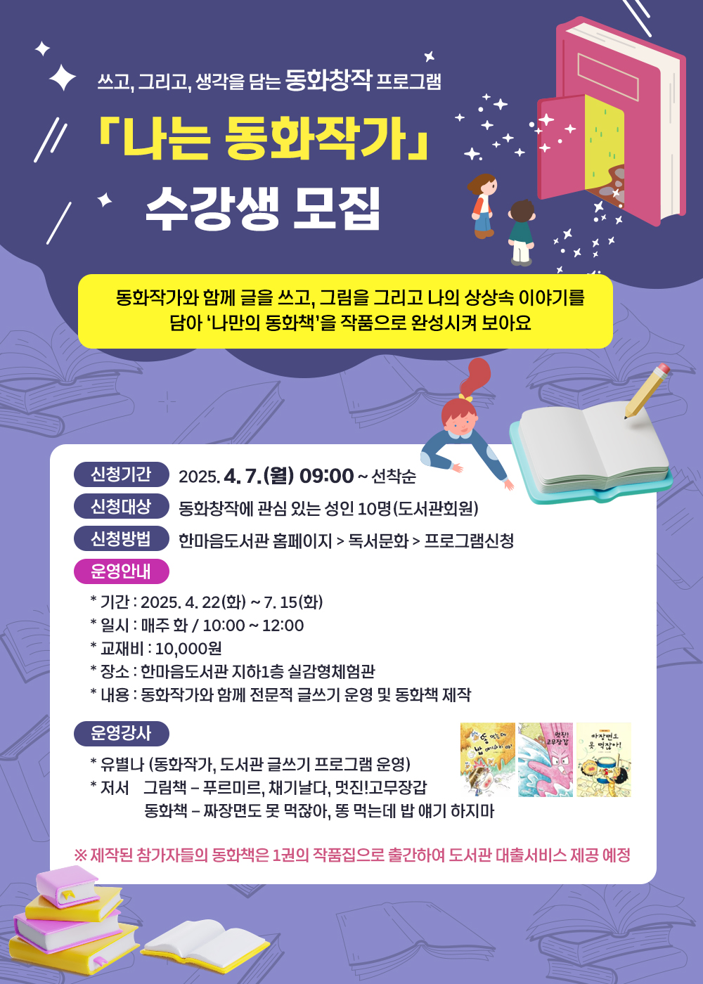 신청대상 : 동화창작에 관심있는 성인 10명(도서관 회원)