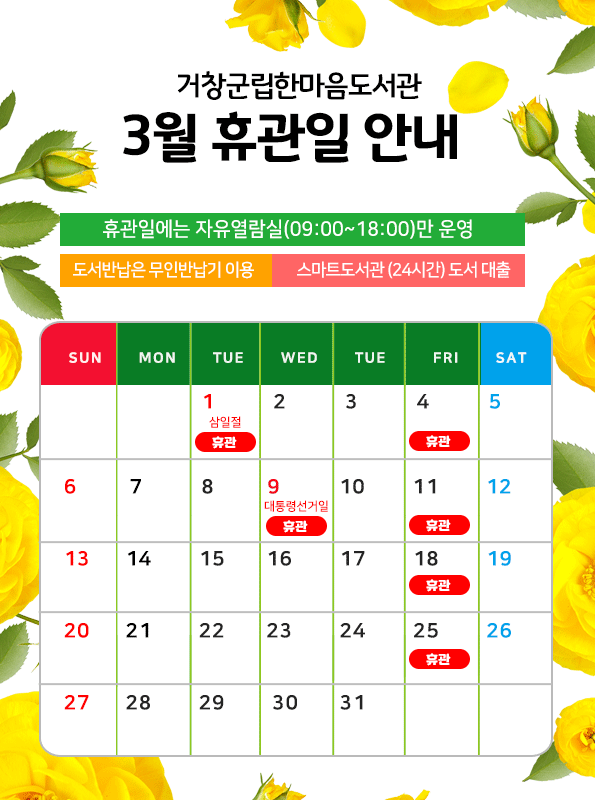 3월 정기휴관 : 3/1(삼일절), 3/9(대통령선거일), 정기휴관-금요일 (3/4,3/11,3/18,3/25)