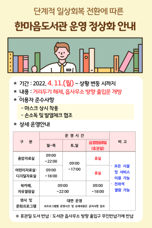 한마음도서관 운영 정상화 4.11.(월) ~ 상황 변동 시까지