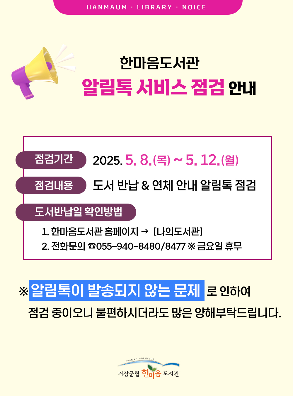 ♣ 내 용 : 도서 반납, 도서연체 안내 알림톡이 발송되지 않는 문제로 인하여 점검 중이오니 불편하시더라도 많은 양해부탁드립니다.