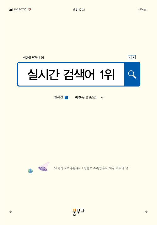‘지구의 종말’ 디데이를 앞둔 청소년들의 마음을 위로하고 소통하며 사람들의 심리와 다양한 모습을 보여주고 있는 책이다. 사실과 거짓이 함께 공존하는 요즘의 인터넷 세상에서 ‘실시간 검색어’ 순위에 따라 다양하게 영향을 받는 모습을 톡톡 튀는 문체와 아슬아슬하게 꼬리에 꼬리를 무는 궁금증을 풀어가는 재미에 단숨에 읽힌다.