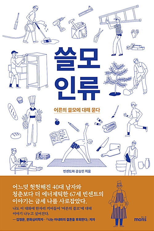 나이 따위는 잊고 매일 Just do it과 Do it yourself를 실천하는 빈센트에게서 저자는 이 시대 ‘쓸모 인류’의 면모를 보았다. 빈센트, 강승민 두 남자의 대화를 통해 독자는 힘든 날을 버티는 기술, 생활 공간을 효율적으로 관리하는 방식, 인간 관계를 정리하는 과정을 배운다.